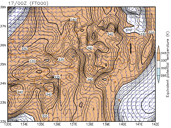 モデルの925hPaの相当温位は地上実況と比較すると秩父(12時347k)は適当で、三島(12時339k)は過大です。